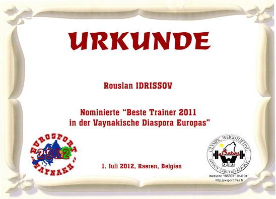 1-го июля с.г. группой спортивных активистов в Европе была проведена церемония награждения лучших спортсменов, тренеров и судей 2011 года из вайнахской диаспоры. Руслан Идрисов был назван одним из первых и ему присудили почетный Кубок и диплом. Разумеется, Идрисов находится вне всяких конкурсов и конкуренций, как единственный в мире тренер-инвалид, который с 1977 года и по сегодняшний день учит наших детей, ежеминутно рискуя своей жизнью. Но, это было единственное, что мы могли сделать для Руслана, который несомненно заслуживает гораздо большего.