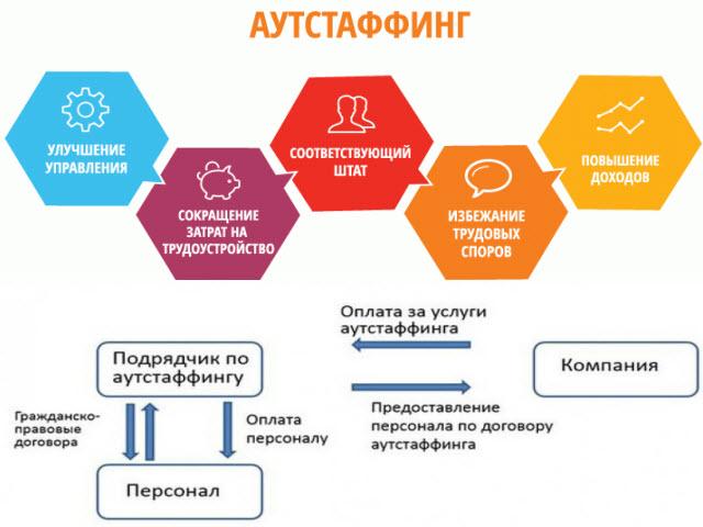 Благодаря аутстаффингу организация может избавиться от ряда проблем: Не нужно оформлять штат. Нет необходимости выделять рабочие кабинеты. Работники на аутсорсинге не могут быть уволены по сокращению, то есть они будут числиться в штате организации до конца действия договора. Нет необходимости содержать бухгалтерию и кадровые отделы. Это может существенно облегчить управление компанией. В том случае, если сотрудник в течение двух лет уволится, то его можно будет вернуть обратно.Аутстаффинг – это привлечение работников со стороны. Сотрудники могут быть оформлены как на постоянную основу, так и по договору подряда. Также некоторые фирмы практикуют предоставление «временного персонала». Таким образом, компания получает возможность сэкономить на заработной плате и сократить расходы на кадровые ресурсы.