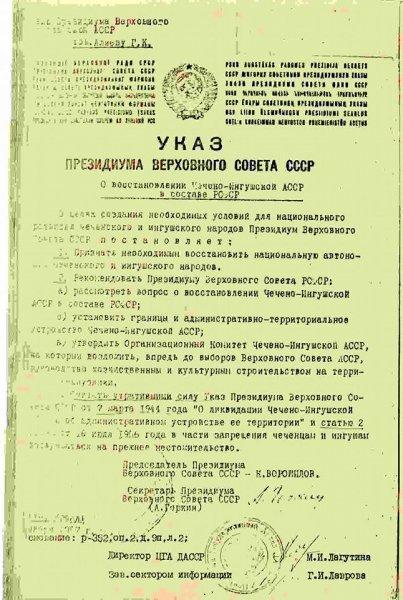 Так и случилось. Уже 21 июня 1956 г. состоялось заседание Президиума ЦК КПСС, на котором была создана комиссия в составе: Л.И. Брежнев -секретарь ЦК КПСС, Н.И. Беляев - секретарь ЦК КПСС, одновременно заместитель председателя Бюро ЦК КПСС по РСФСР, К.Е. Ворошилов - председатель Президиума Верховного Совета СССР, Г.М. Маленков - заместитель председателя Совета Министров СССР, А.И. Микоян - первый заместитель председателя Совета Министров СССР - председатель комиссии. Ее главная задача: изучение вопросов, связанных с реабилитацией репрессированных народов. В последующем эту комиссию называли «комиссией Микояна». Работа этой комиссия и привела к восстановлению ЧИАССР на Сесверном Кавказе