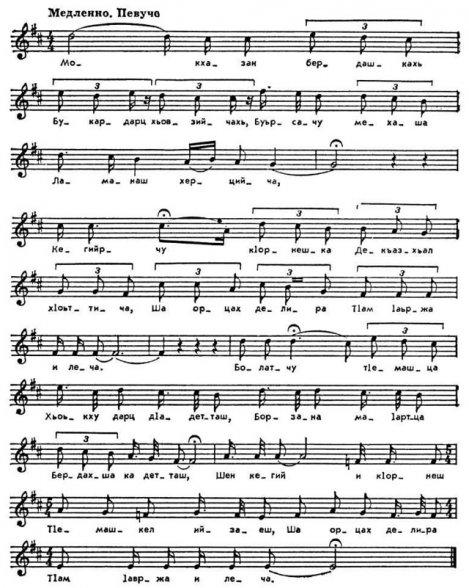 Впервые профессиональная запись чеченских народнык мелодий в нотном исполнении была опубликованы И. В. Добровольским в его "Азиатском музыкальном журнале" (1818, No 6). Добровольский (Иван) - учитель музыки в астраханской гимназии, капельмейстер хора преосвященного Анастасия (Братановского). В 1816 - 1818 гг. издавал в Астрахани "Азиатский музыкальный журнал" (№ 1 - 8), имеющийся только в библиотеках Академии Наук и Казанского университета.