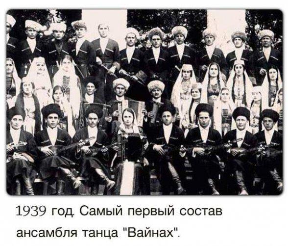 1939 год. В этом году был создан ансамбль "Вайнах" как ансамбль песни и танца. На фото его самый первый состав. Имнно в этом ансамбле начинали свой творческий путь Народный артист СССР, Герой Социалистического Труда Махмуд Эсамбаев, Андарбек Садыков, Ваха Дакашев, Гелани Юсупов, другие известные в Чечне танцовщики. После депортации чеченцев и ингушей ансамбль прекратил своё существование.